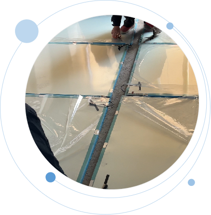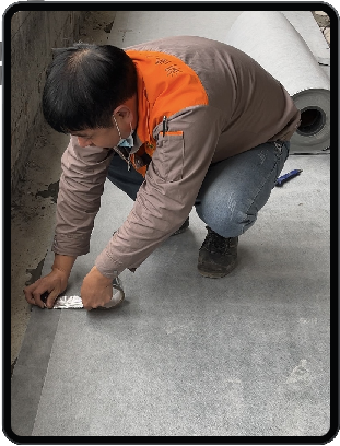 盖防水布并用单面胶固定,防止贴瓷砖时渗水、水泥砂损坏发热板。